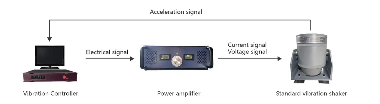 Вибрация или ударное движение генерируются вибростендом в ответ на усиленный управляющий сигнал, поступающий от контроллера. Акселерометр передает собранный сигнал контроллеру для коррекции в реальном времени и отправляет его обратно на усилитель мощности.